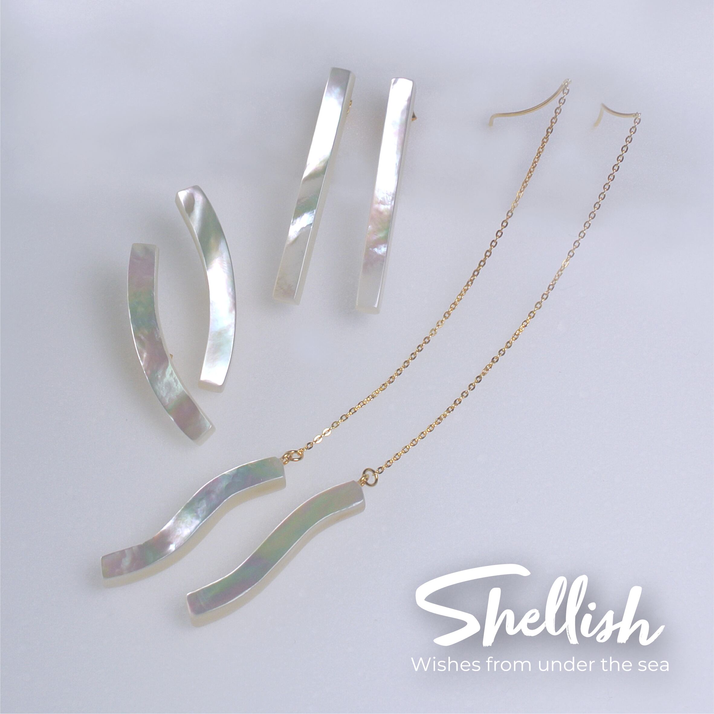 繊細さが特徴のS字カーブ型スクエアバータイプのマザーオブパールピアス。