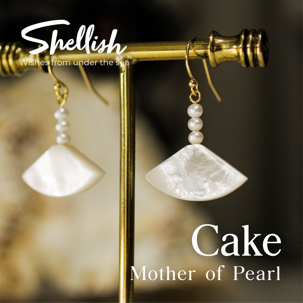 扇型にカットしたマザーオブパールと小粒のパールが揺らめくオリエンタルな雰囲気が楽しめるピアスです。